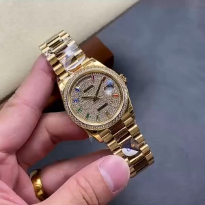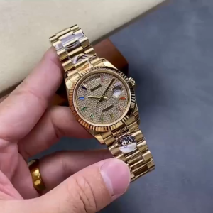 Rolex Day Date 36mm Yellow Gold 128238 0051 Pave Rainbow Diamond Dial Fluted Bezel