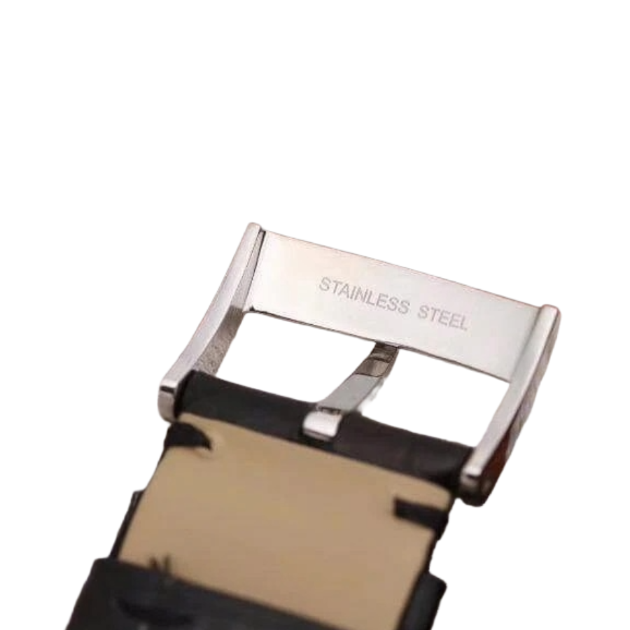 The black leather strap adds another layer of classic appeal. It’s comfortable, adjustable to fit all wrist sizes, and features a stainless steel fold clasp that ensures both security and convenience. The overall aesthetic is refined, making it ideal for business attire, evening events, or elevating your everyday wardrobe.