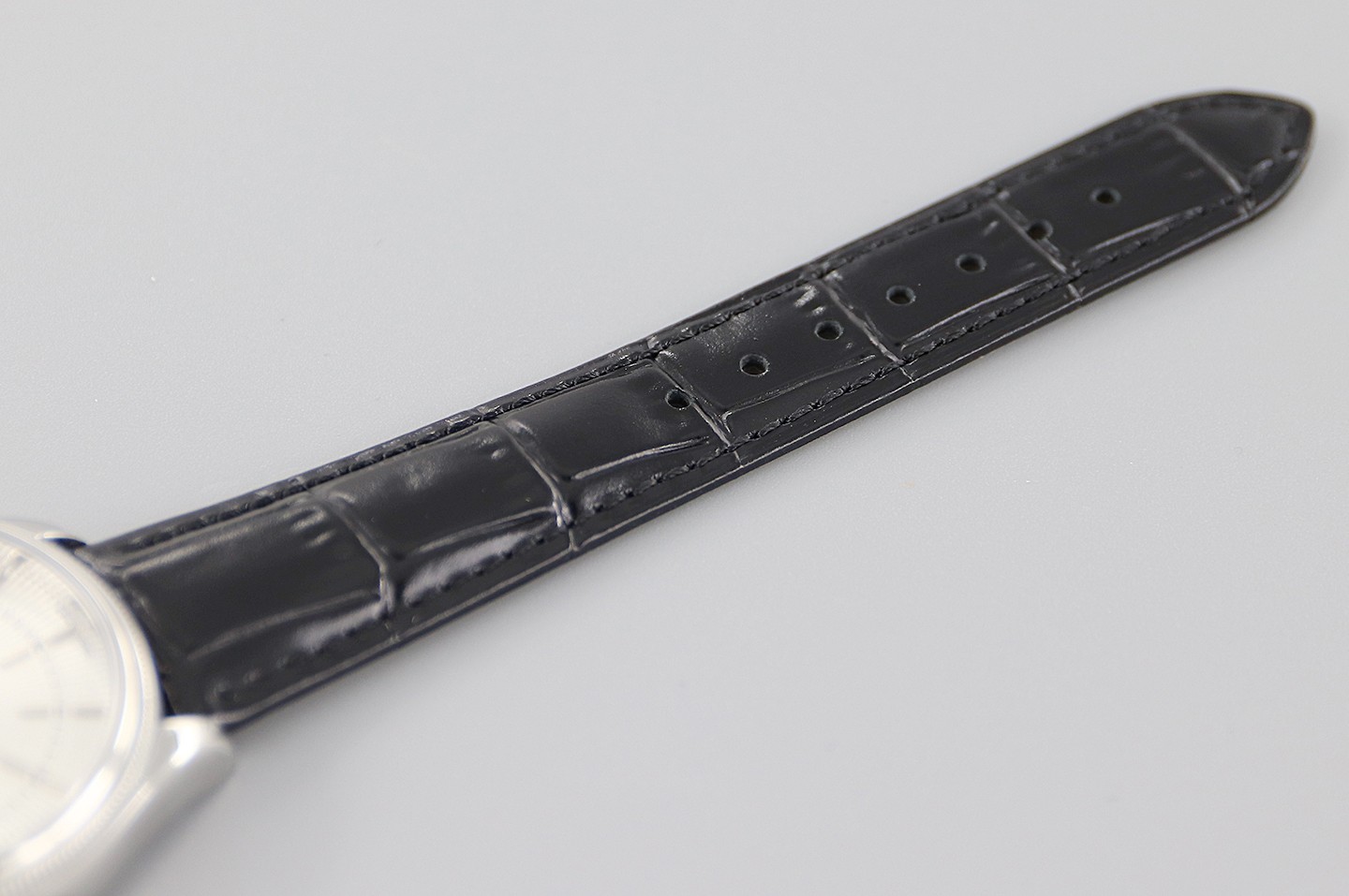 Rolex Cellini Date 50519 Black Leather Silver Dial 39mm Mens Replica Watch has a white Gold 39 mm Round Case with Screw Down Crown and a White Gold Bezel.Scratch resistant sapphire crystal.Silver sunburst guilloche dial with raised polished baton hour markers. Fine printed minute/seconds track. Date subdial at 3 o”clock aperture. Black Leather Bracelet will look great on your wrist with white gold tang buckle.