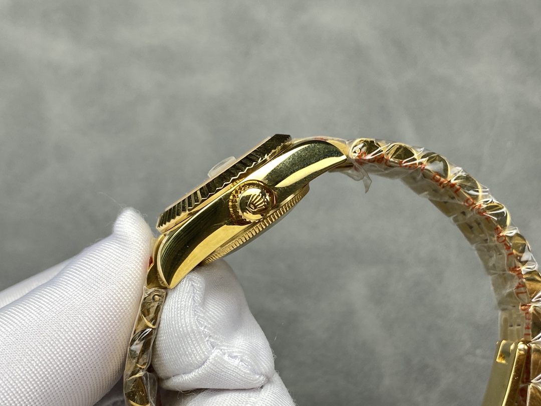 Rolex Datejust 279178 Champagne Diamond Dial Fluted Bezel 28mm Lady Replica Watch, has a yellow gold 28 mm Round Case with Screw Down Crown and a yellow gold Fluted Bezel.Champagne dial with 9 diamonds set in star shaped hour marker settings. A Diamond-filled Roman numeral IX at the 9 o’clock position.Yellow gold President bracelet with semi-circular three-piece links, concealed folding Crownclasp buckle.
