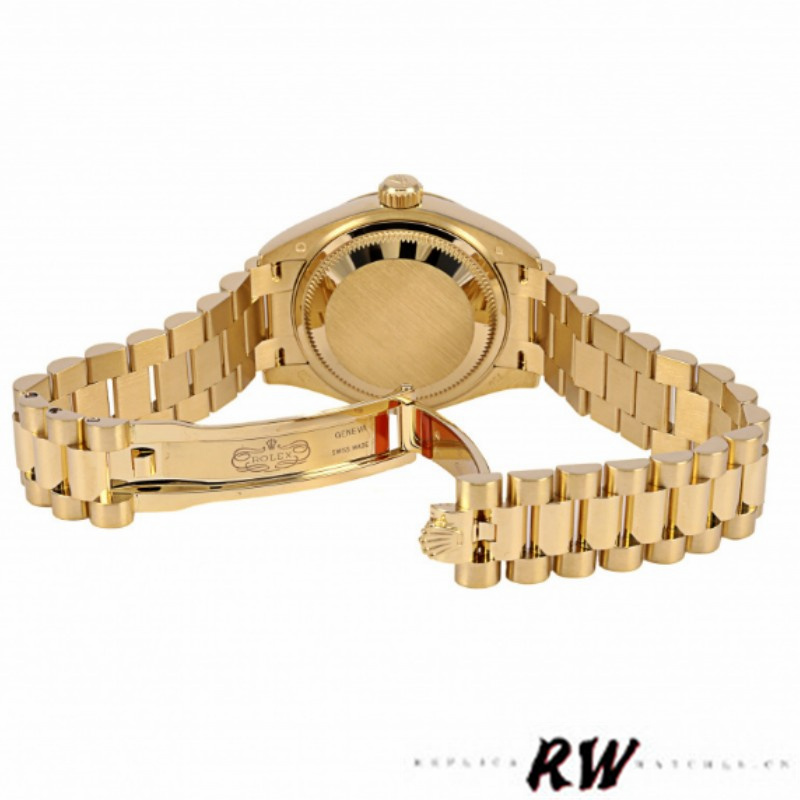 Rolex Datejust 279178 Lilac Purple Dial Fluted Bezel 28mm Lady Replica Watch, has a yellow gold 28 mm Round Case with Screw Down Crown and a yellow gold Fluted Bezel.Lilac Purple dial with Index Diamond hour marker. A Diamond-filled Roman numeral IX at the 9 o’clock position.Yellow gold President bracelet with semi-circular three-piece links, concealed folding Crownclasp buckle.