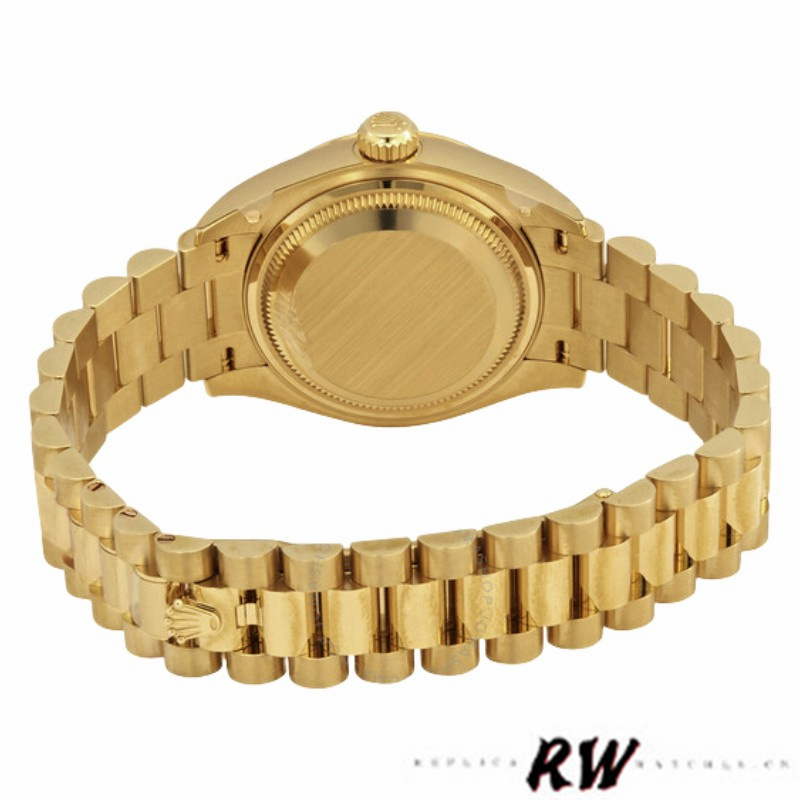 Rolex Datejust 279178 Mint Green Diamond Dial Fluted Bezel 28mm Lady Replica Watch, has a yellow gold 28 mm Round Case with Screw Down Crown and a yellow gold Fluted Bezel.Mint Green dial with Diamond hour marker. Date Window Displayed at 3 O’Clock,Yellow gold President bracelet with semi-circular three-piece links, concealed folding Crownclasp buckle.