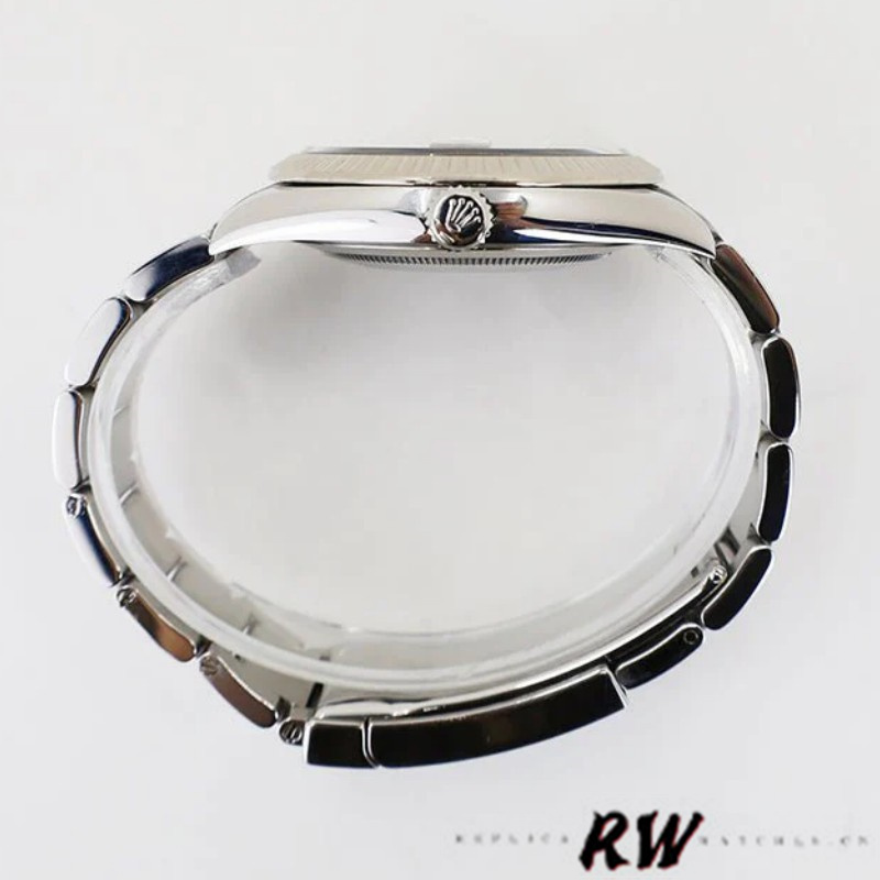Rolex Datejust 126334 Fluted Bezel Black Diamond Dial 41MM Mens Replica Watch features 41mm a polished Oystersteel stainless steel case, Polished solid white gold fixed fluted bezel. Black dial, 10 diamond hour markers,Date displayed under cyclops lens in window at 3 o’clock with instantaneous date setting. Stop-seconds feature for precise time setting. A scratch resistant sapphire crystal protects the dial.Polished with brushed Oystersteel stainless steel Jubilee bracelet.Folding Oysterclasp deployment buckle with Easylink comfort extension link.