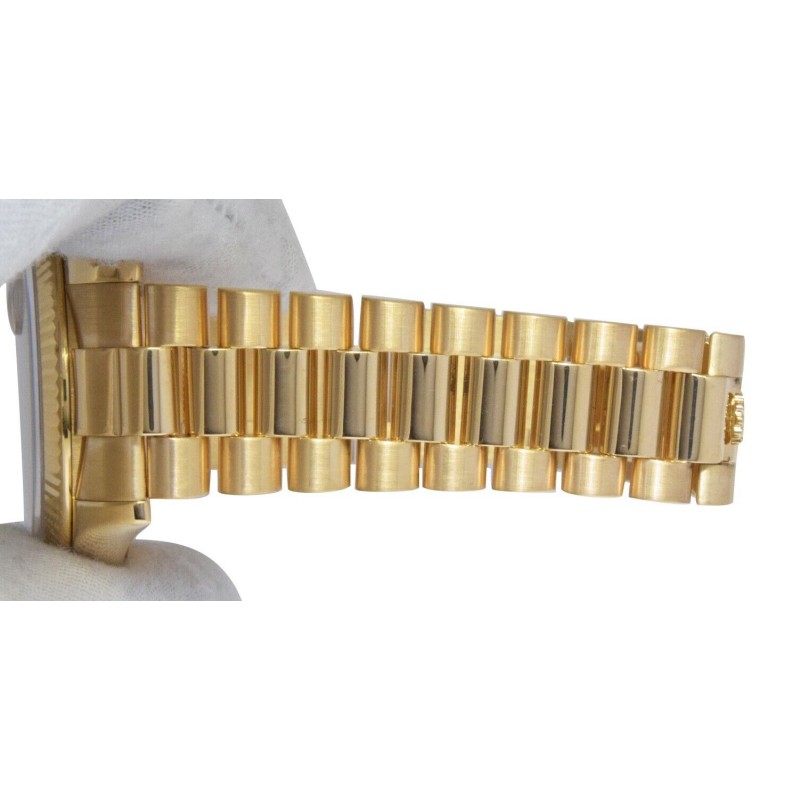 Rolex Day-Date 118238 Champagne Dial Arabic Numeral 36mm Unisex Replica Watch has a Yellow Gold 36 mm Round Case with Screw Down Crown and a Yellow Gold Fluted Bezel . Champagne Dial with Arabic Dial Markers. Day and date display at 12 and 3 o’clock with a cyclops magnifying lens.Yellow gold president bracelet and an yellow gold hidden deployant clasp.