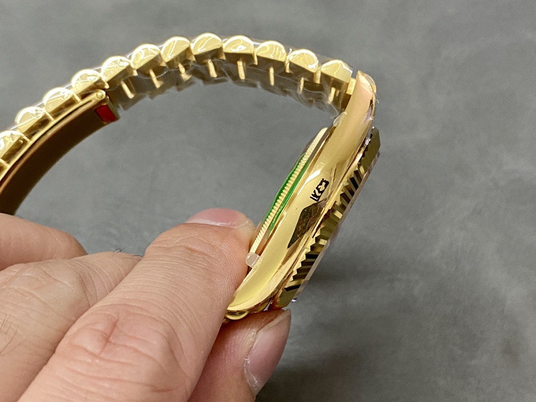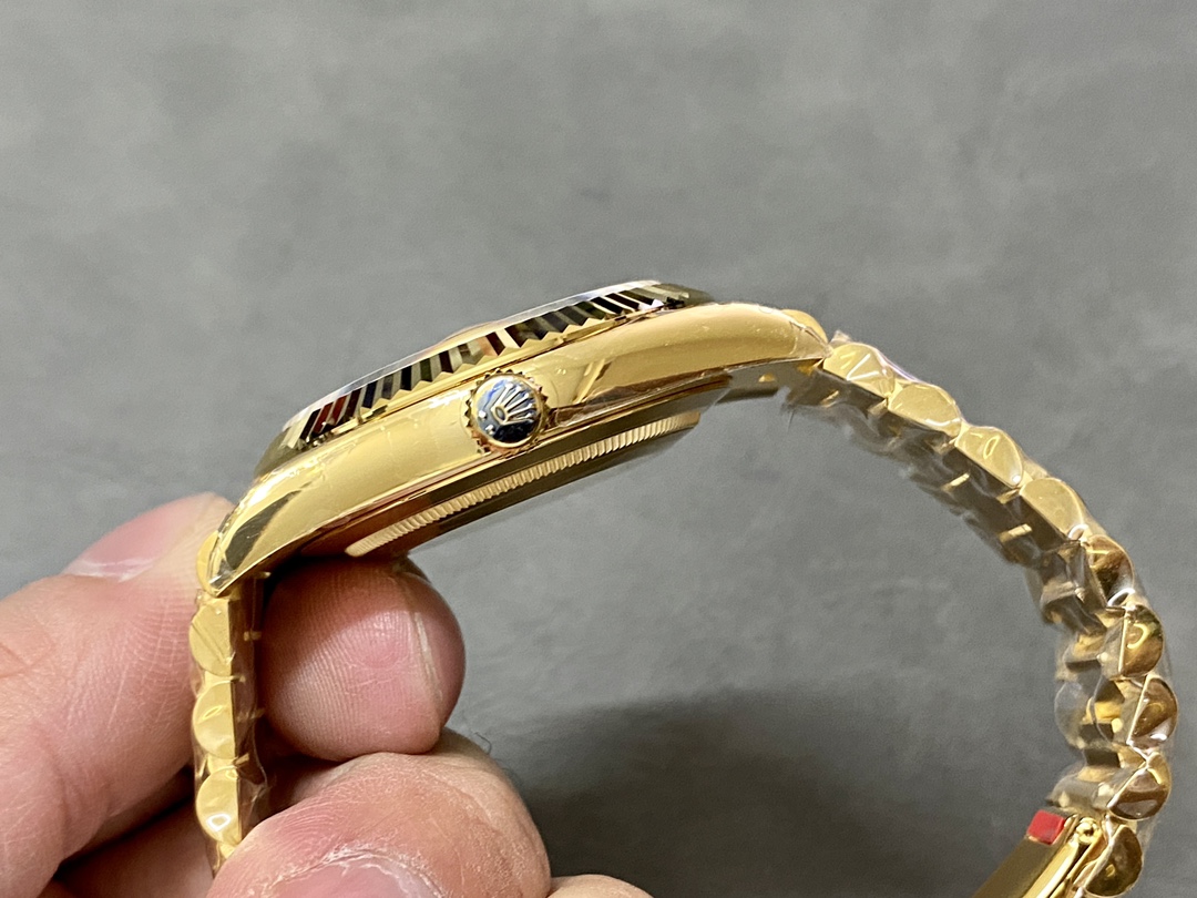 Rolex Day-Date 128238 Fluted Bezel Champagne Index Dial 36MM Unisex Replica Watch,36mm yellow gold case, screw-down back, screw-down crown with twinlock double waterproofness system, fluted bezel,Champagne Index Dial with Index Hour Markers.Date window displayed under cyclops lens at 3 o’clock. Day window displayed at 12 o’clock.Instantaneous day and date setting.Yellow gold President bracelet with semi-circular three-piece links, concealed folding Crownclasp buckle.