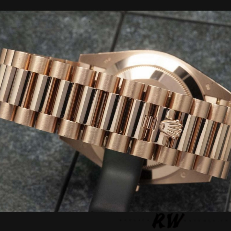 Rolex Day-Date 228235 Sundust Stripe Motif Dial Fluted Bezel 40mm Mens Replica Watch, featuring a 40mm Everose Gold case, solid case back with screw-down crown and fluted bezel. Scratch-resistant sapphire crystal with Cyclops magnifying glass.Sundust Stripe Motif Dial with Index hour markers, date window at 3 o’clock, day of the week window at 12 o’clock, Everose Gold three-piece presidential bracelet with deployant clasp.