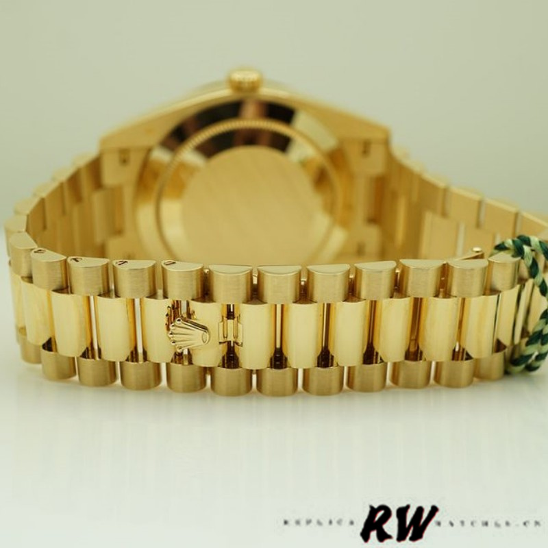 Rolex Day-Date 228398TBR Champagne Index Dial Diamond Bezel 40mm Mens Replica Watch, featuring a 40mm yellow gold case, solid case back with screw-down crown and Diamond Bezel. Scratch-resistant sapphire crystal with Cyclops magnifying glass.Champagne Dial with Index Hour Markers, date window at 3 o’clock, day of the week window at 12 o’clock,Yellow Gold President Bracelet with Concealed folding Crownclasp deployment buckle.