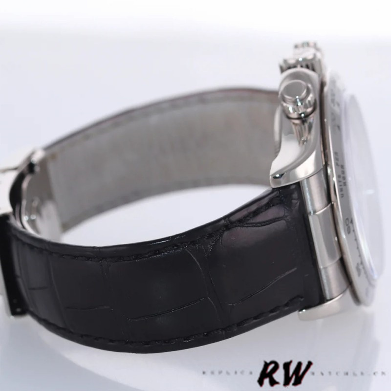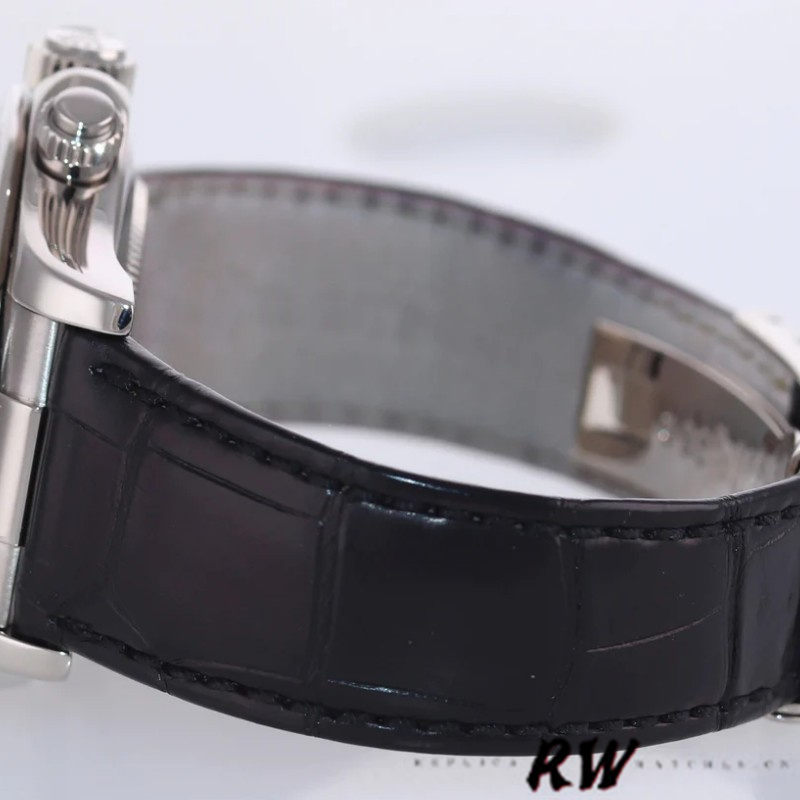 Rolex Daytona 116519 Mother of Pearl Arabic Dial 40mm Mens Replica Watch.40mm White Gold case,bezel, winder and deployant clasp, Mother of pearl dial with Arabic numeral hour markers. Minute markers around the outer rim. 30 minute recorder at 3 o’clock, 60 second recorder at 6 o’clock, 12 hour recorder at 9 o’clock,Black leather strap, sapphire crystal glass.
