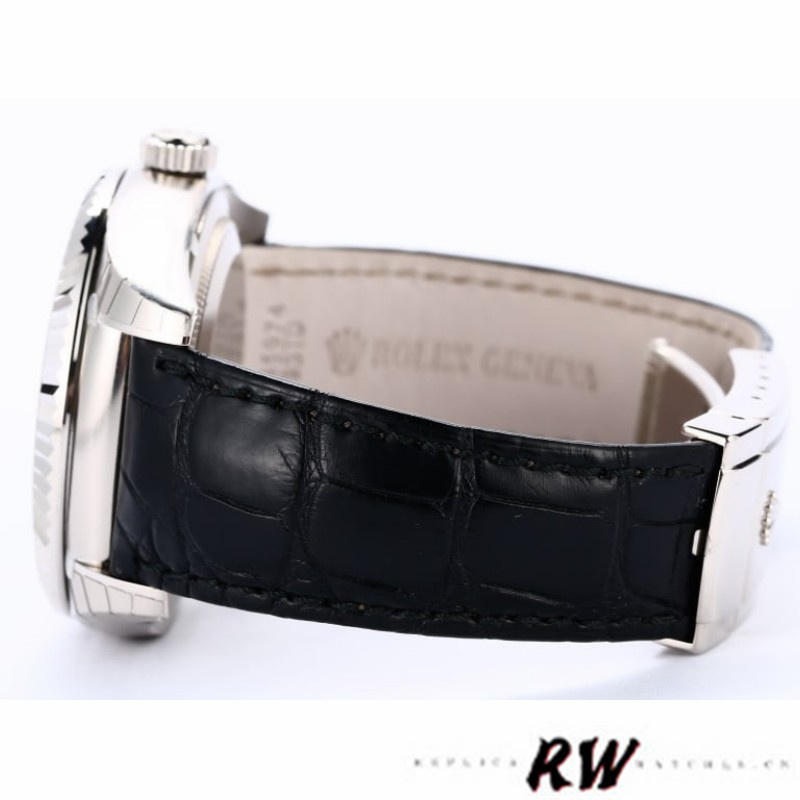 Rolex Sky-Dweller 326139 Ivory Roman Dial Leather Strap 42MM Mens Replica Watch,42mm white gold case, screw-down back, screw-down crown, fluted bezel with bidirectional rotatable Rolex Ring Command, scratch-resistant sapphire crystal with cyclops lens over the date and double anti-reflective coating, ivory dial,second time-zone displayed via off-center rotating disc, Saros annual calendar with date at 3 o’clock and month indicated in discrete apertures at each of the 12 hour marks, black leather strap, folding Oysterclasp buckle.
