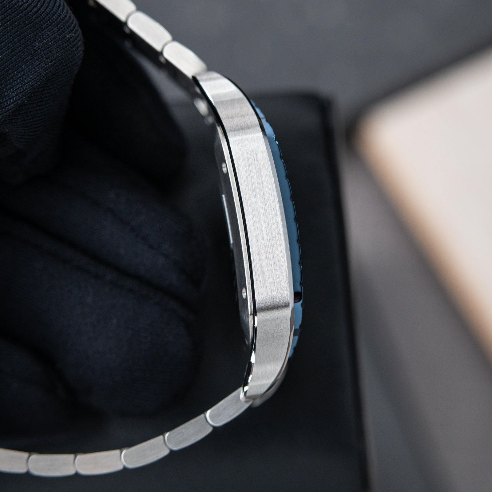 Blue PVD bezel, grey dial, steel bracelet and blue rubber strap