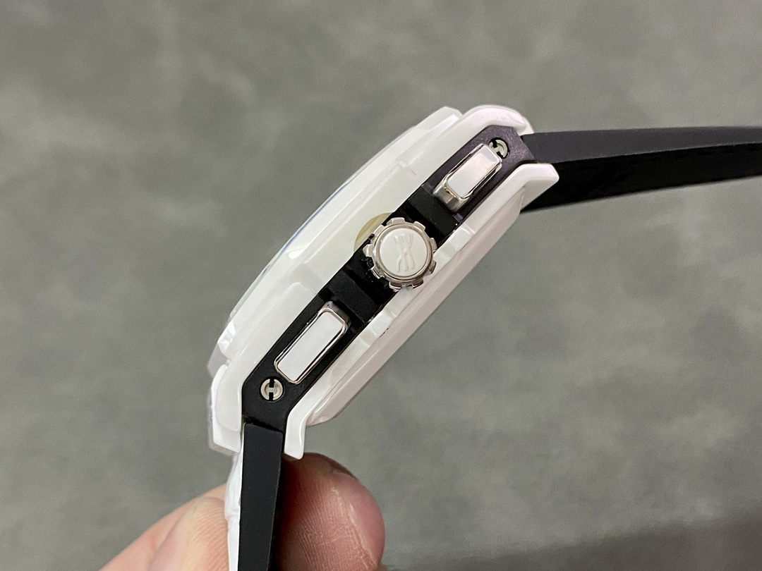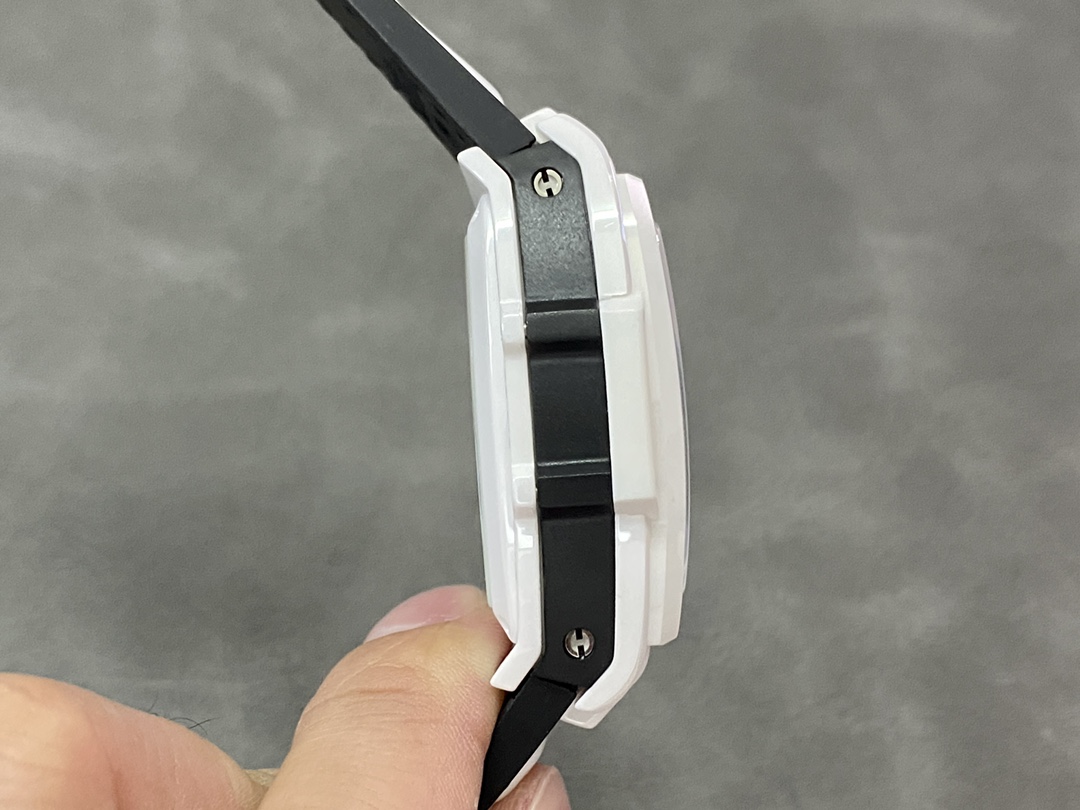 | Bracelet Material: | Black Rubber and White Alligator Leather Straps |